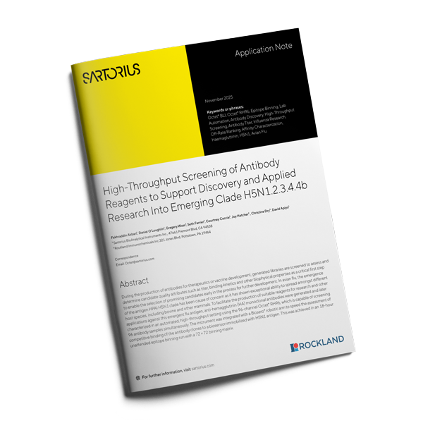 This application note demonstrates how a panel of anti-hemagglutinin (HA) monoclonal antibodies developed by Rockland was leveraged to support automated, high-throughput screening against the emergent H5N1 clade 2.3.4.4b. Using the Octet® RH96 system for label-free biolayer interferometry, large antibody libraries were evaluated for key attributes, including binding kinetics and competitive epitope interactions, at a scale and speed not achievable with conventional approaches. Integration of automated liquid handling enabled extended, unattended epitope binning experiments, generating a comprehensive interaction matrix that revealed distinct, non-competing antibody populations. The study highlights how pairing purpose-built monoclonal reagents with advanced screening workflows accelerates early discovery decisions and strengthens the foundation for downstream therapeutic and vaccine research.